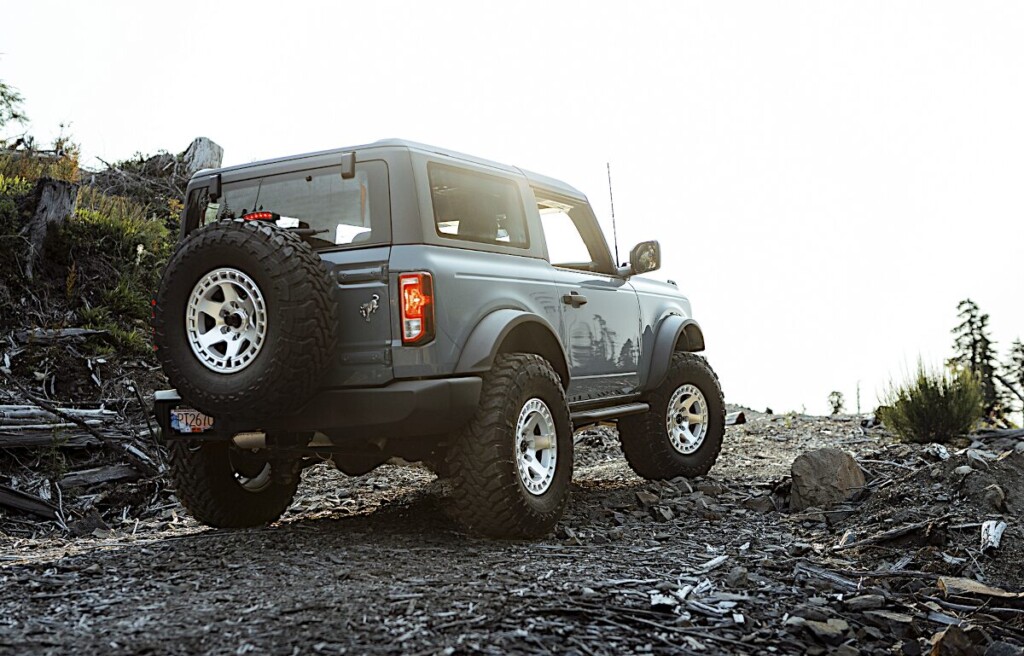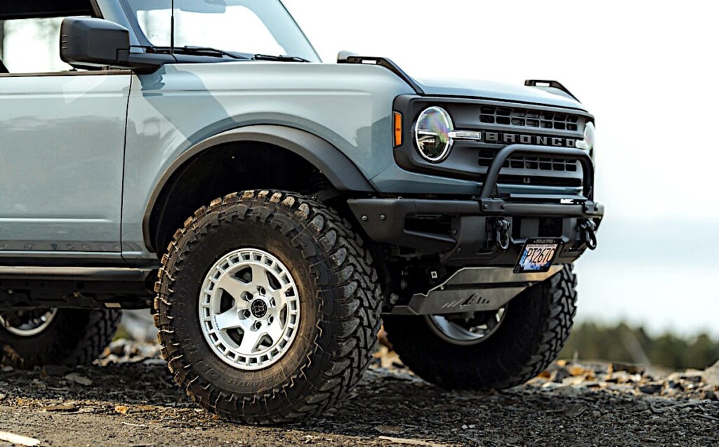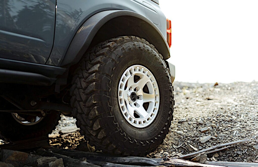 迫力ブラックボディーのフォードブロンコの足元を引き締めるシルバーマシーン6スポークホイール。